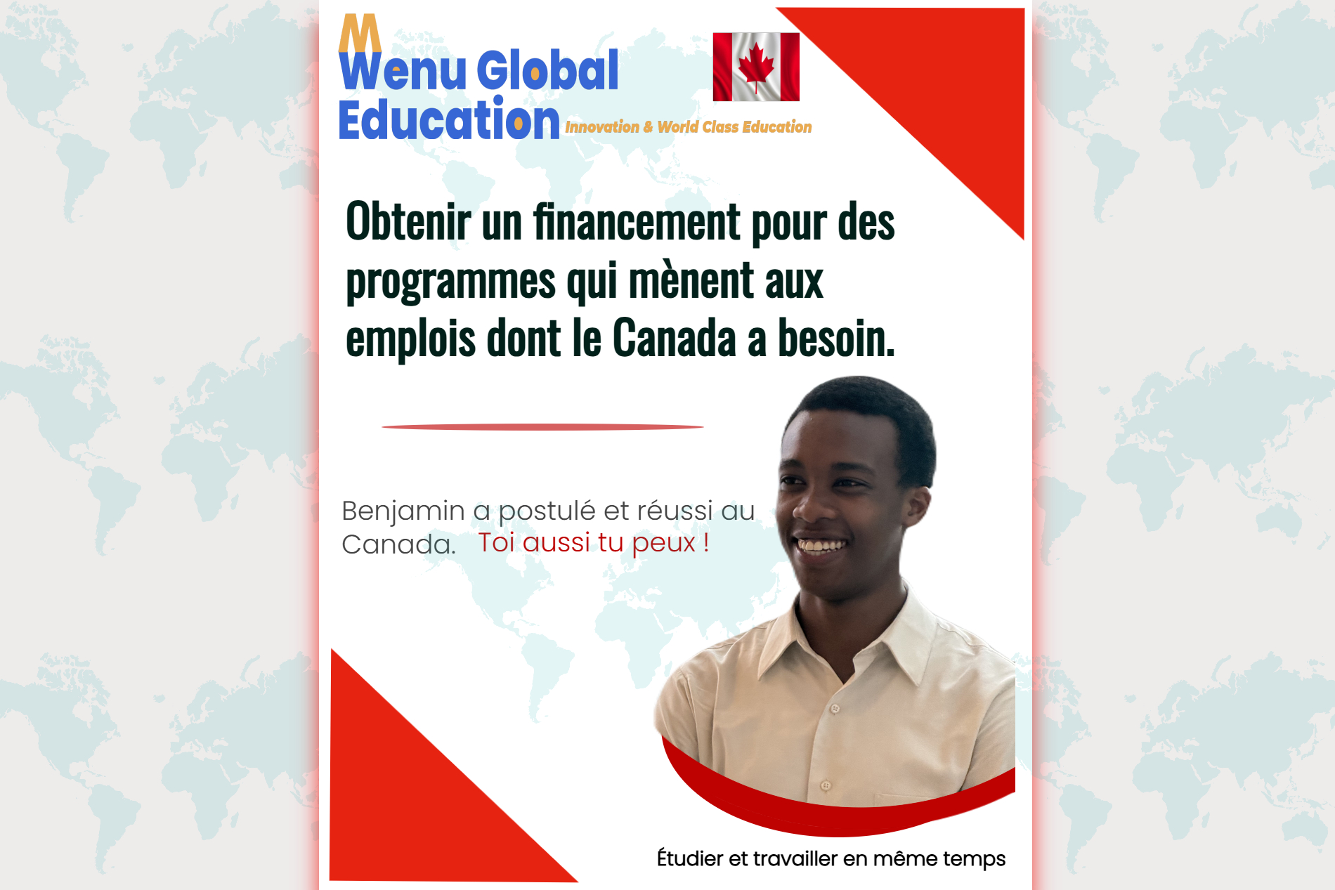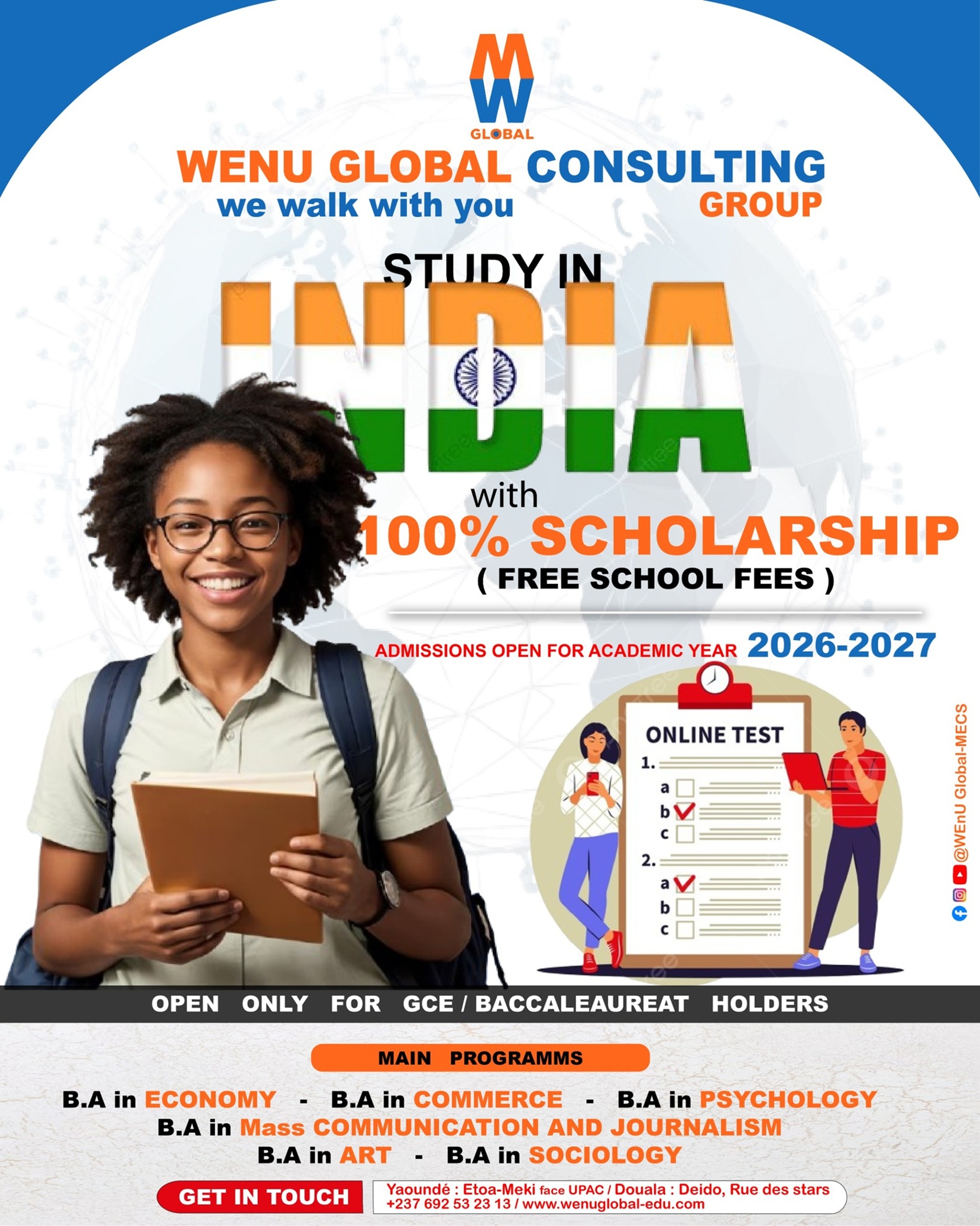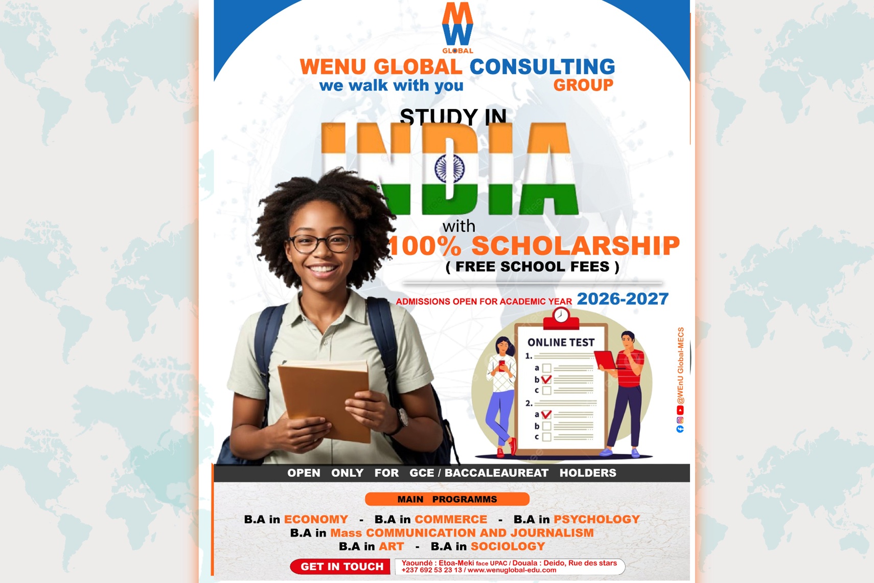 Votre désir est de continuer vos études à l'étranger, et vous ne savez pas par où commencer, vous êtes exactement sur la plate-forme qu'il faut. Nous vous offrons une assistance personnalisée en quelques étapes.